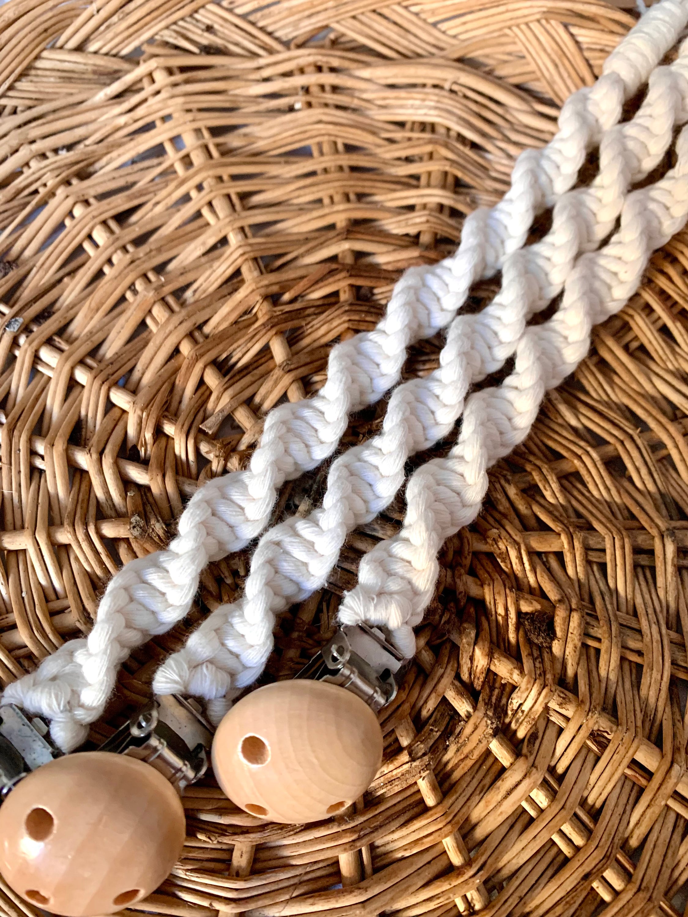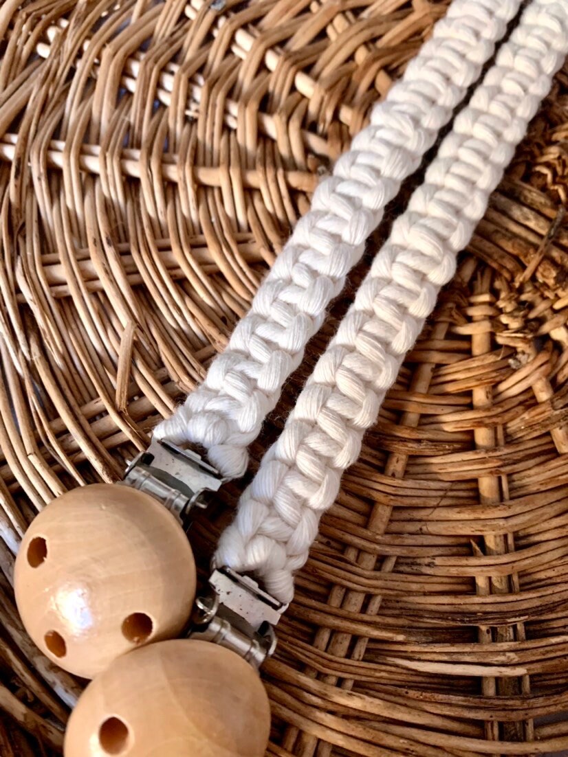 These sweet pacifier chains are handmade from 100% recycled and biodegradable cotton rope. The ropes are of the highest quality and OEKO-TEX Standard 100 certified. The clip is made of natural wood.