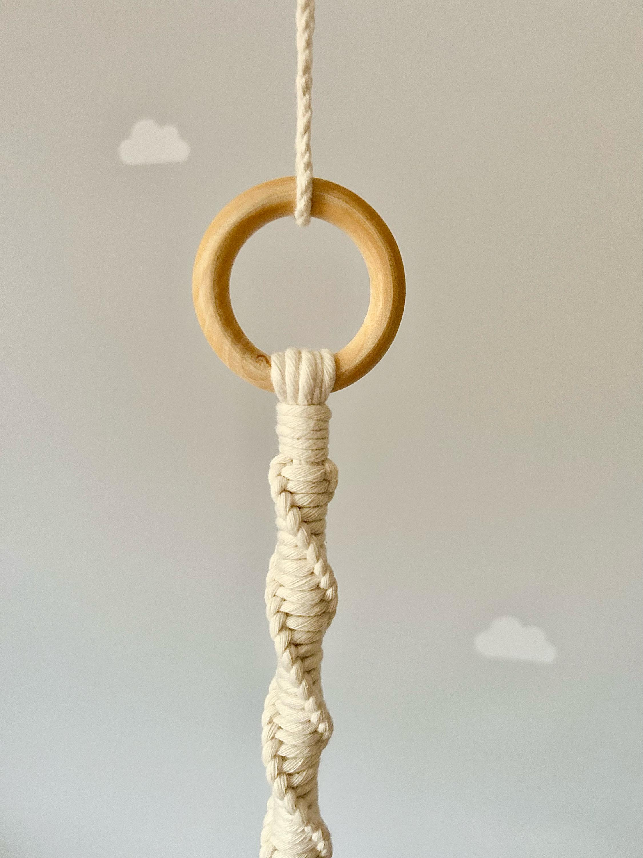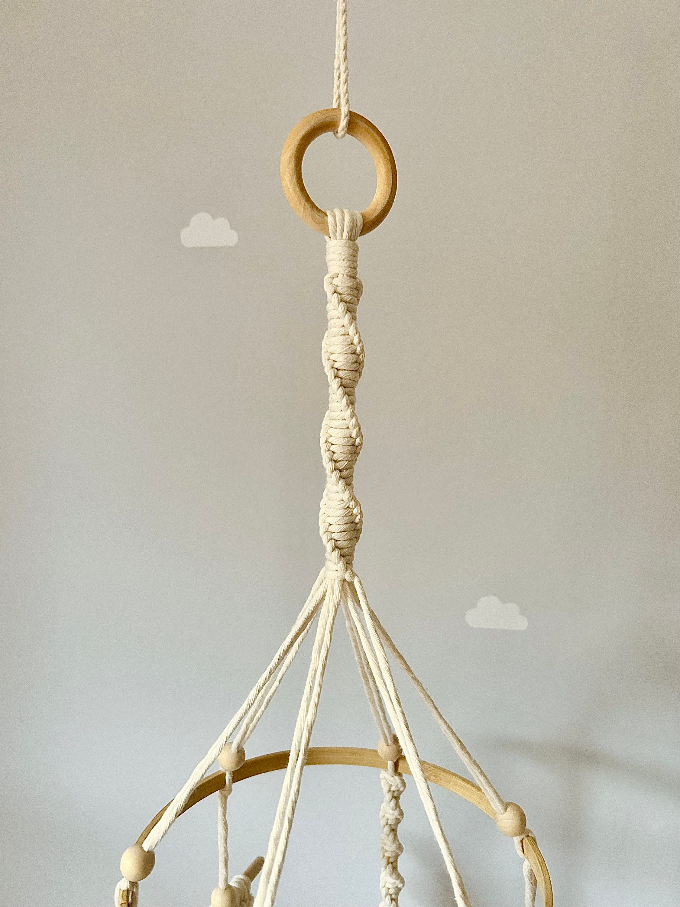 This sweet hanging mobile for the crib or cot is made entirely by hand in macramé with wooden and bamboo accessories and 100% recycled and biodegradable cotton fibres.
