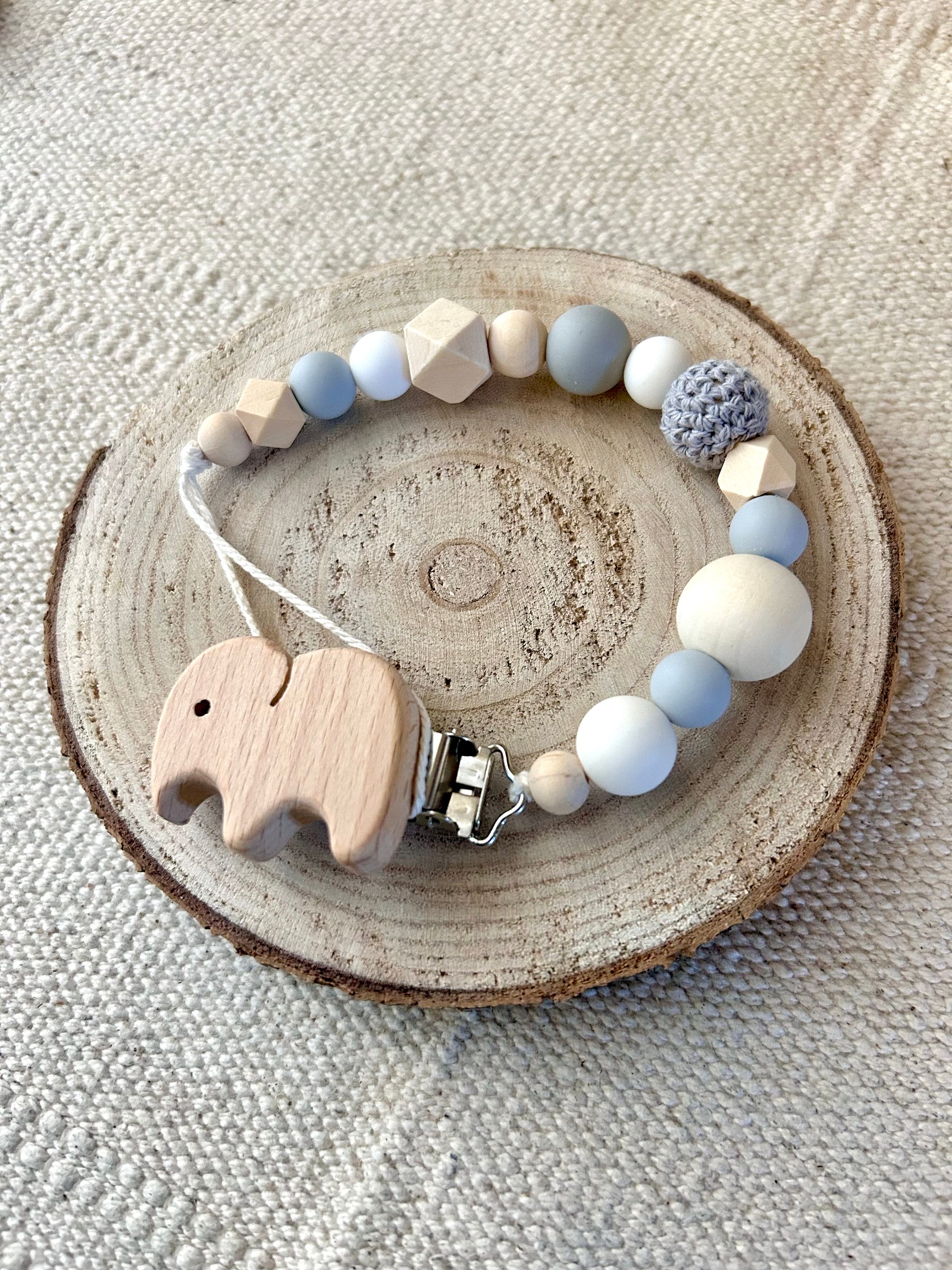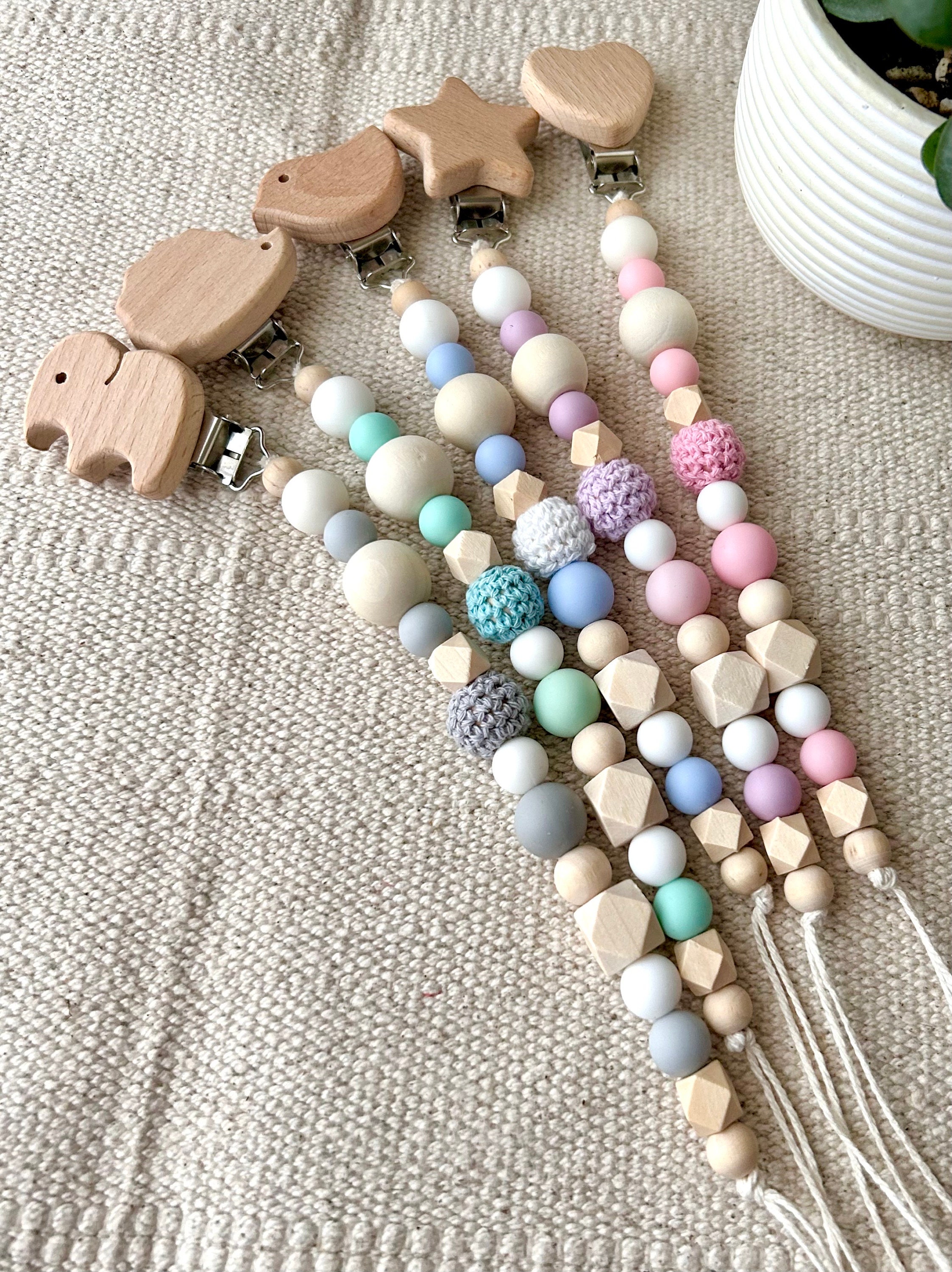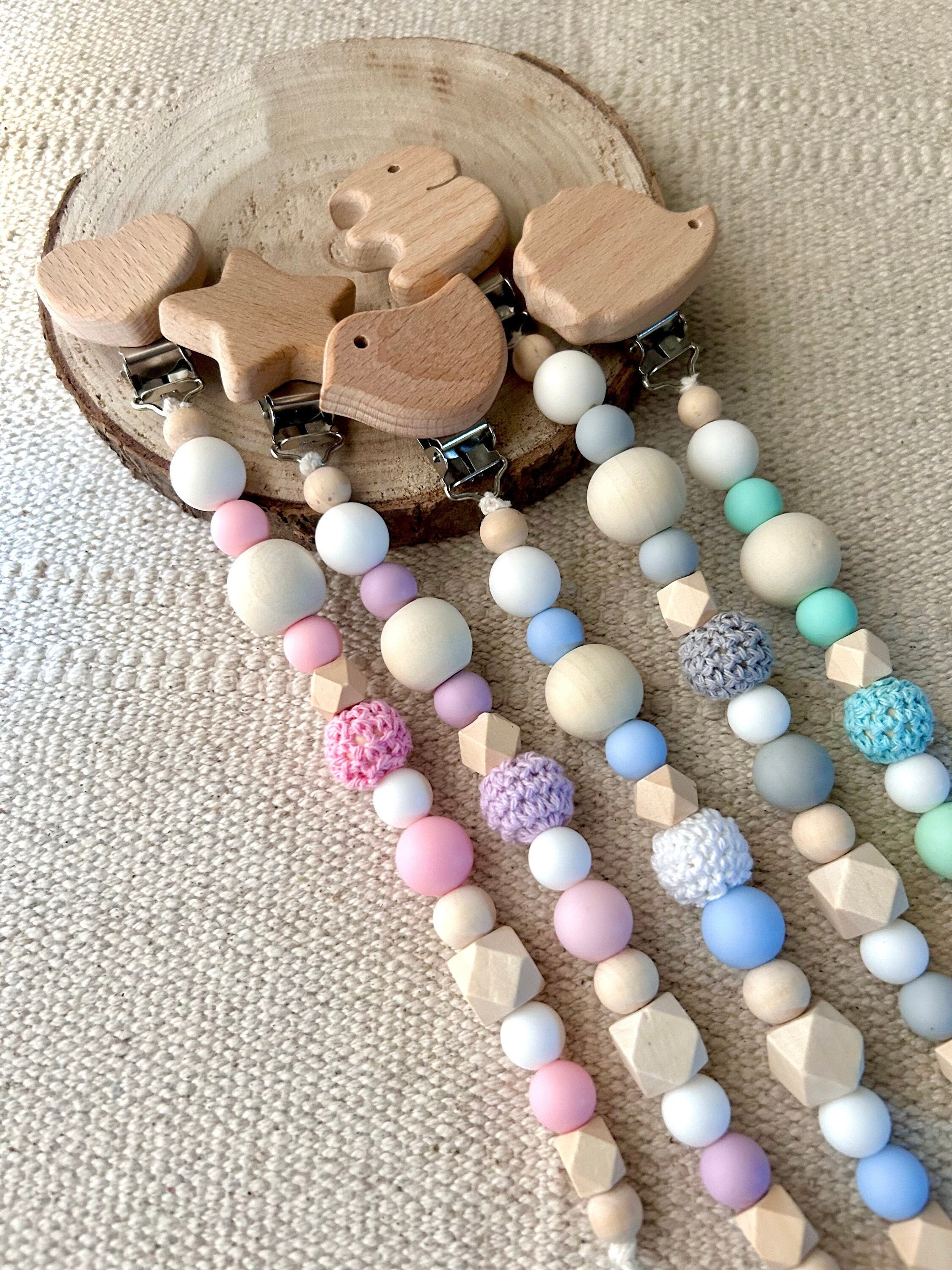 These sweet pacifier chains are handmade from 100% recycled and biodegradable cotton rope and wooden and silicone beads.