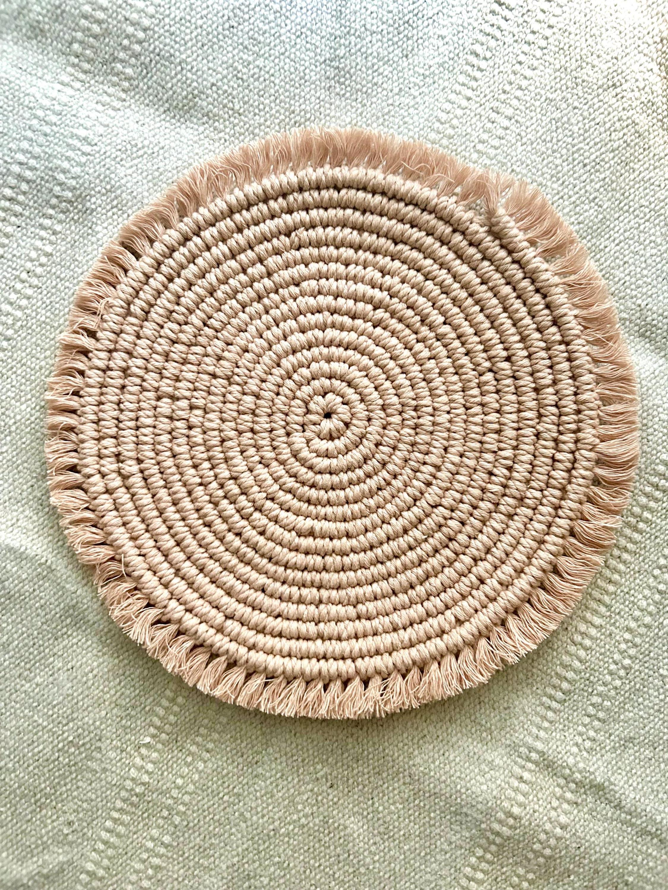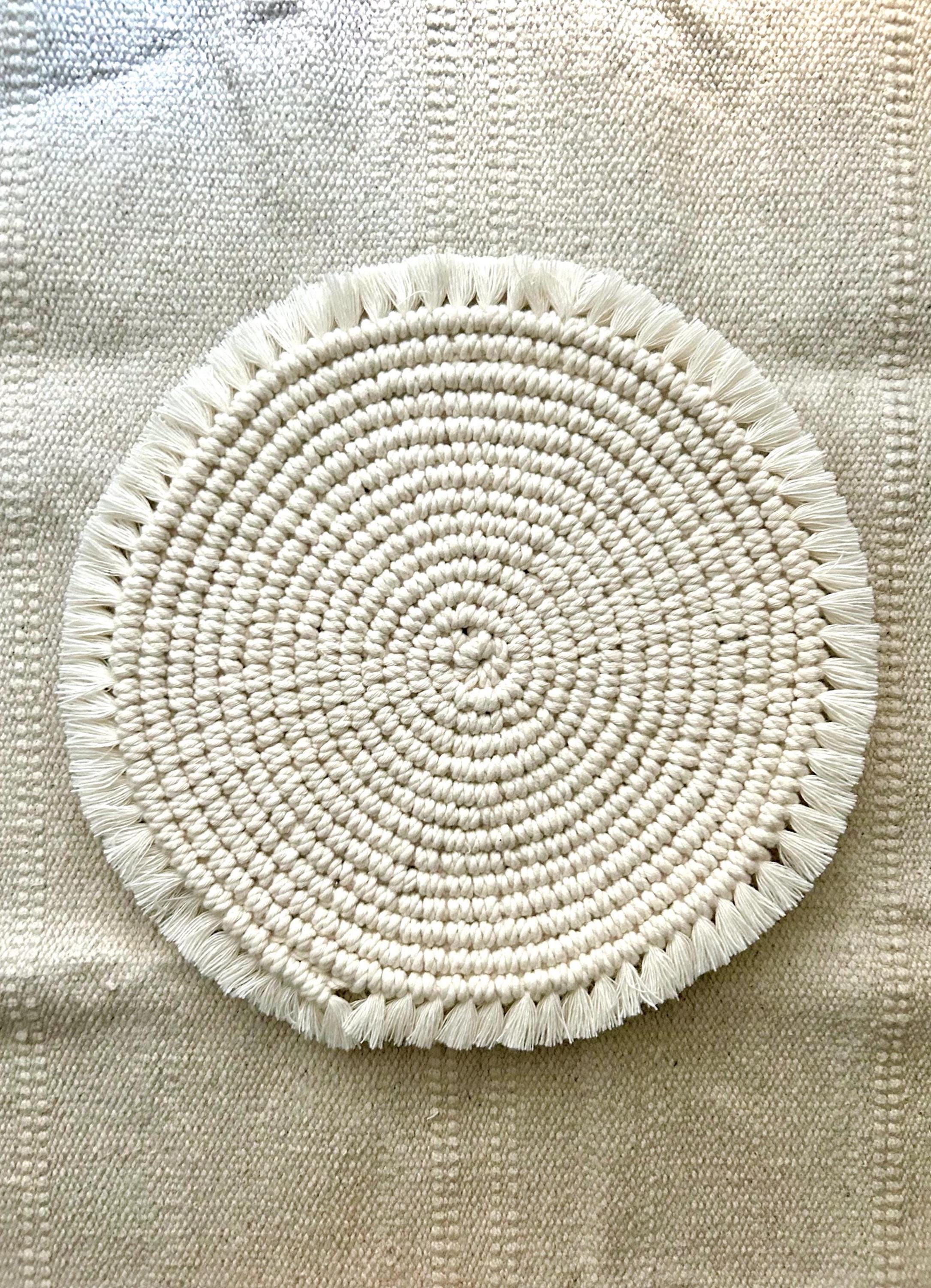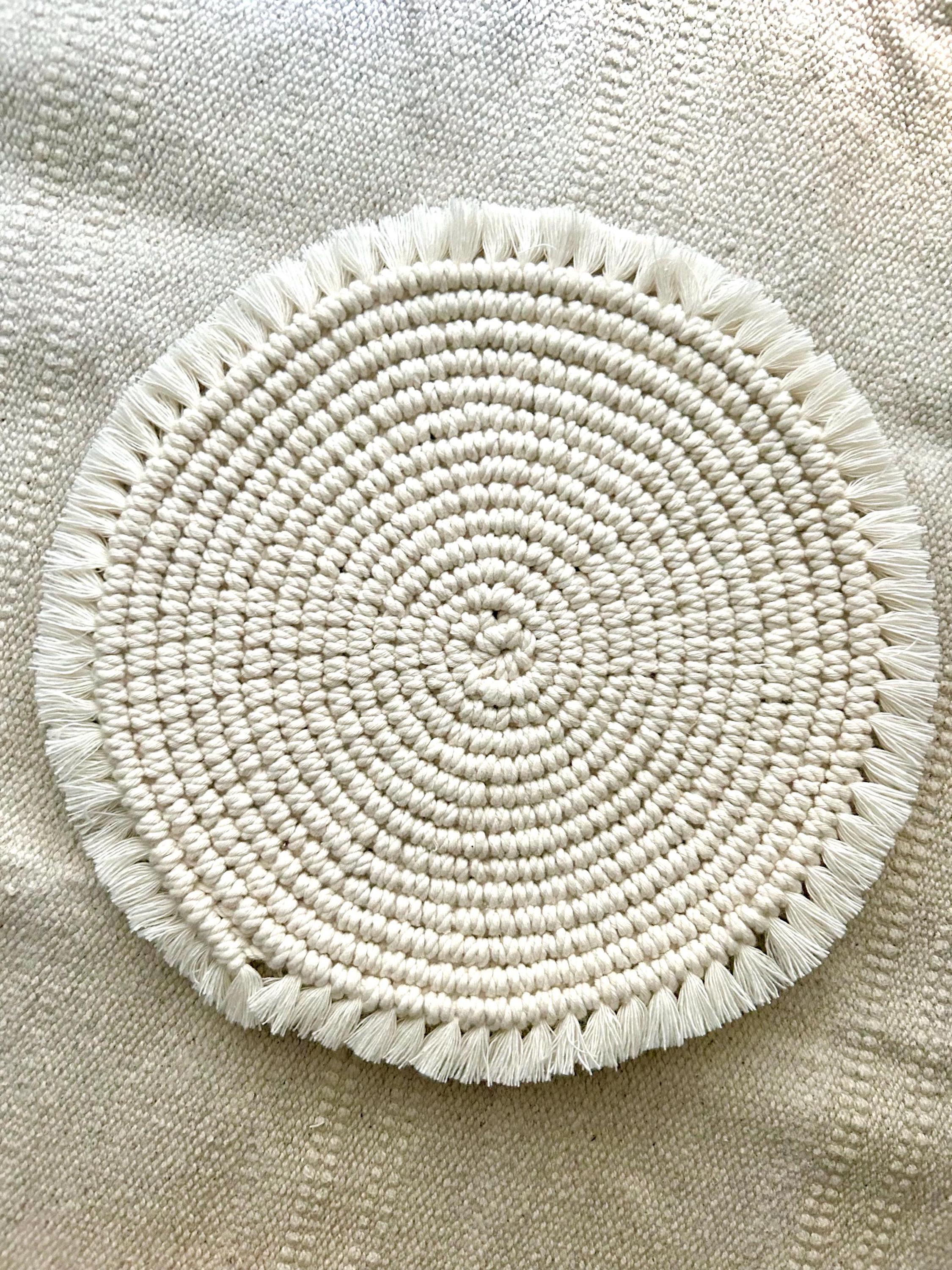 These macrame coasters are handmade using macramé, 100% recycled and biodegradable cotton fibers. They'll look perfect in any home and can be used as decorative accessories, under small or large objects such as rugs, or as coasters or trivets.