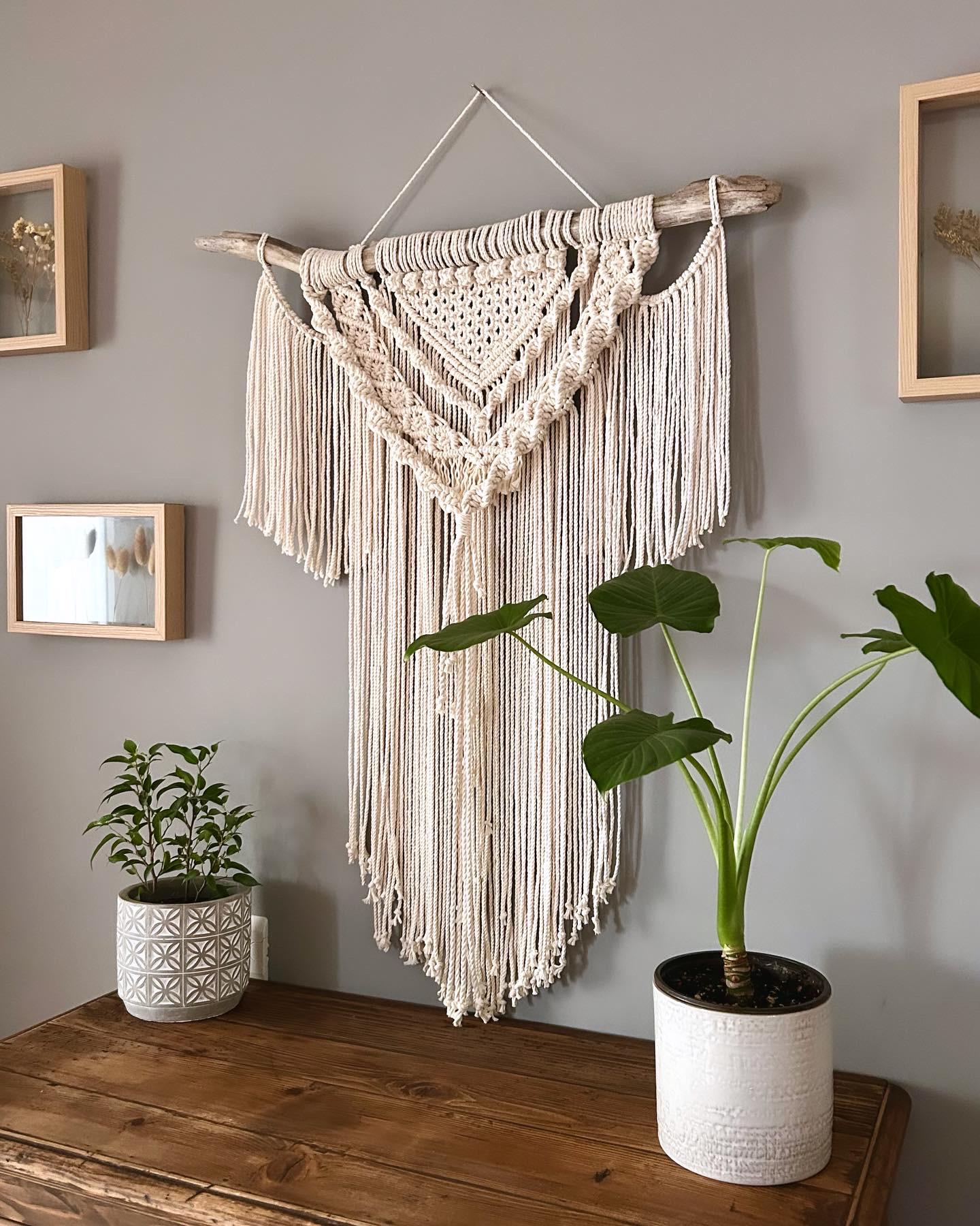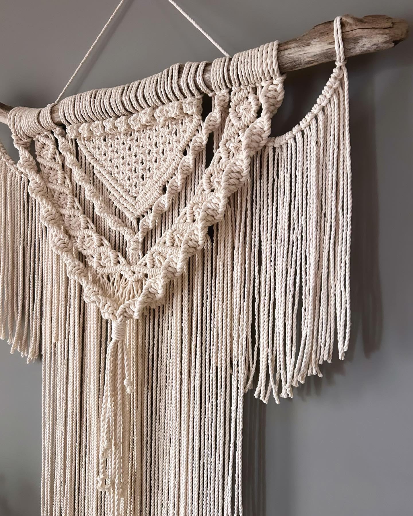This stunning boho-style tapestry is entirely handmade in macramé, with 100% recycled and biodegradable cotton fibers and natural wood harvested and handcrafted.