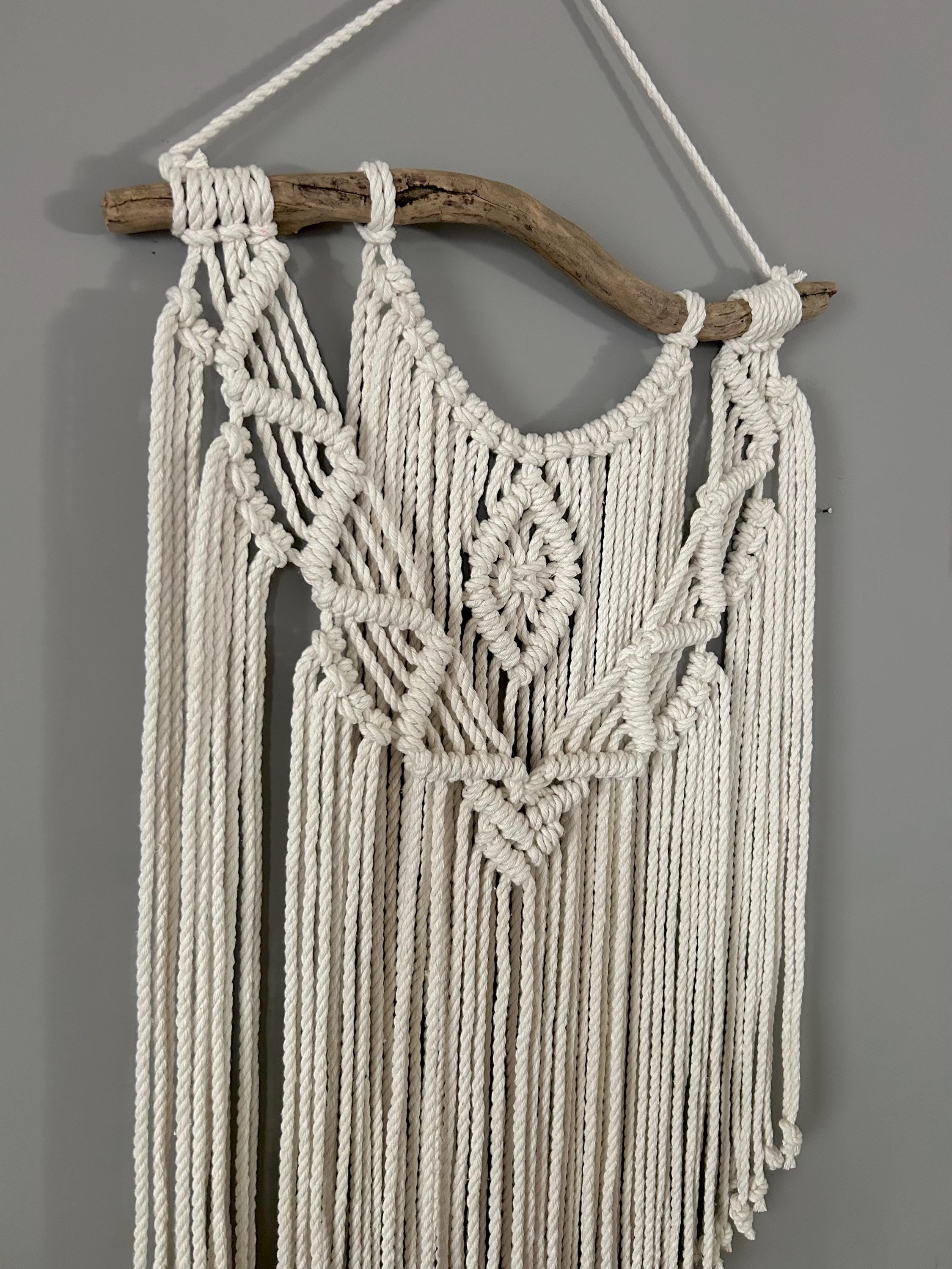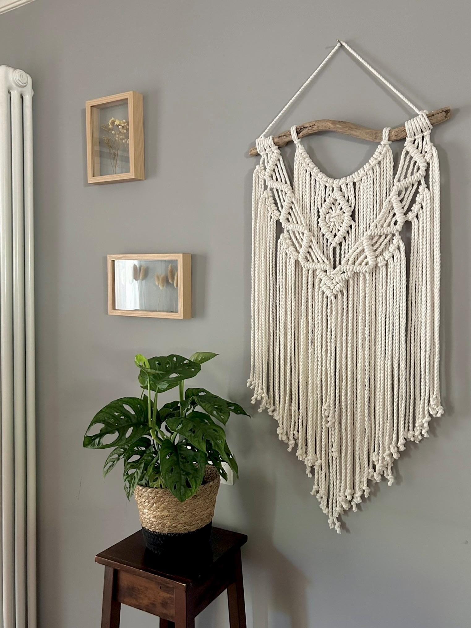 This stunning boho-style tapestry is entirely handmade in macramé, with 100% recycled and biodegradable cotton fibers and natural wood harvested and handcrafted.