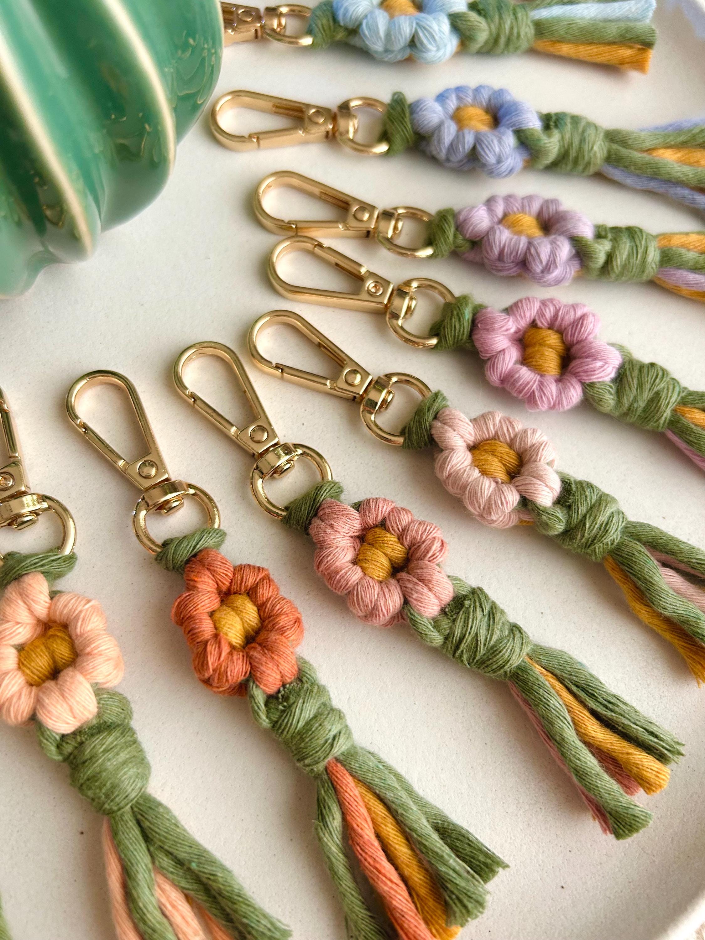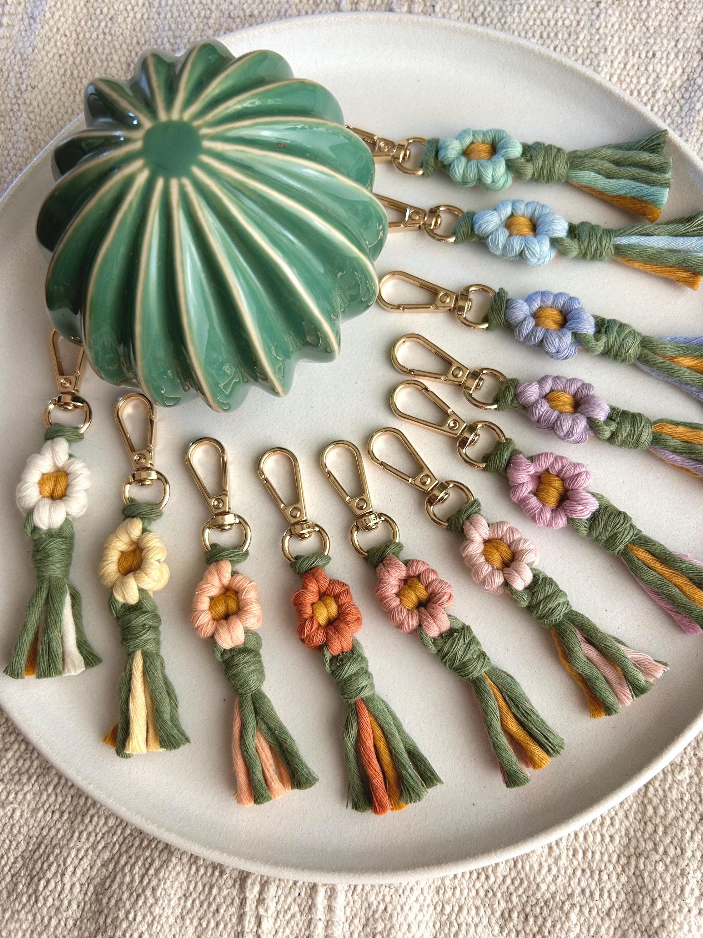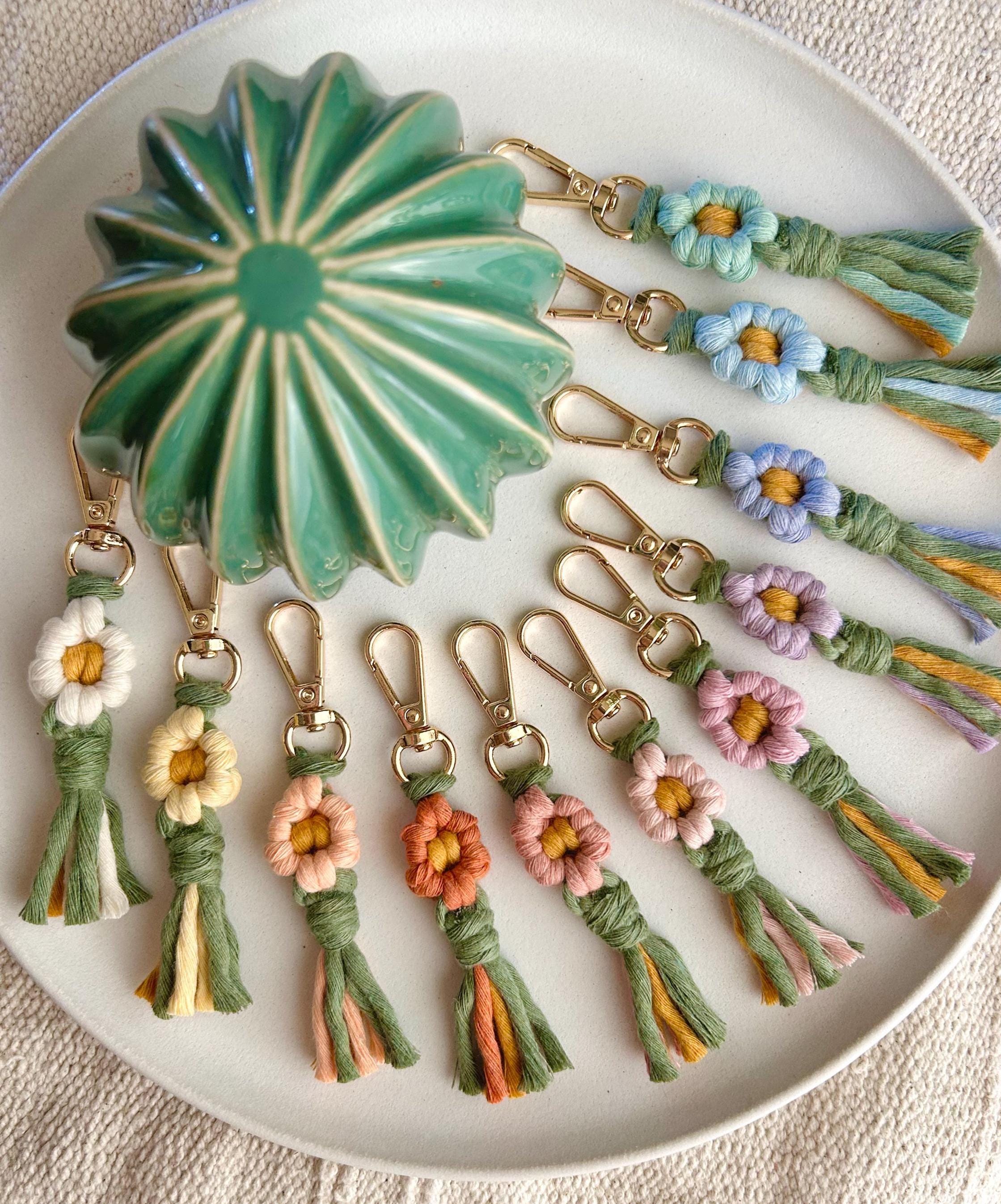 Colorful daisy flower shaped keychains, completely handmade in macramé, with 100% recycled and biodegradable cotton fibers. The ropes are of the highest quality and OEKO TEX Standard 100 certified.