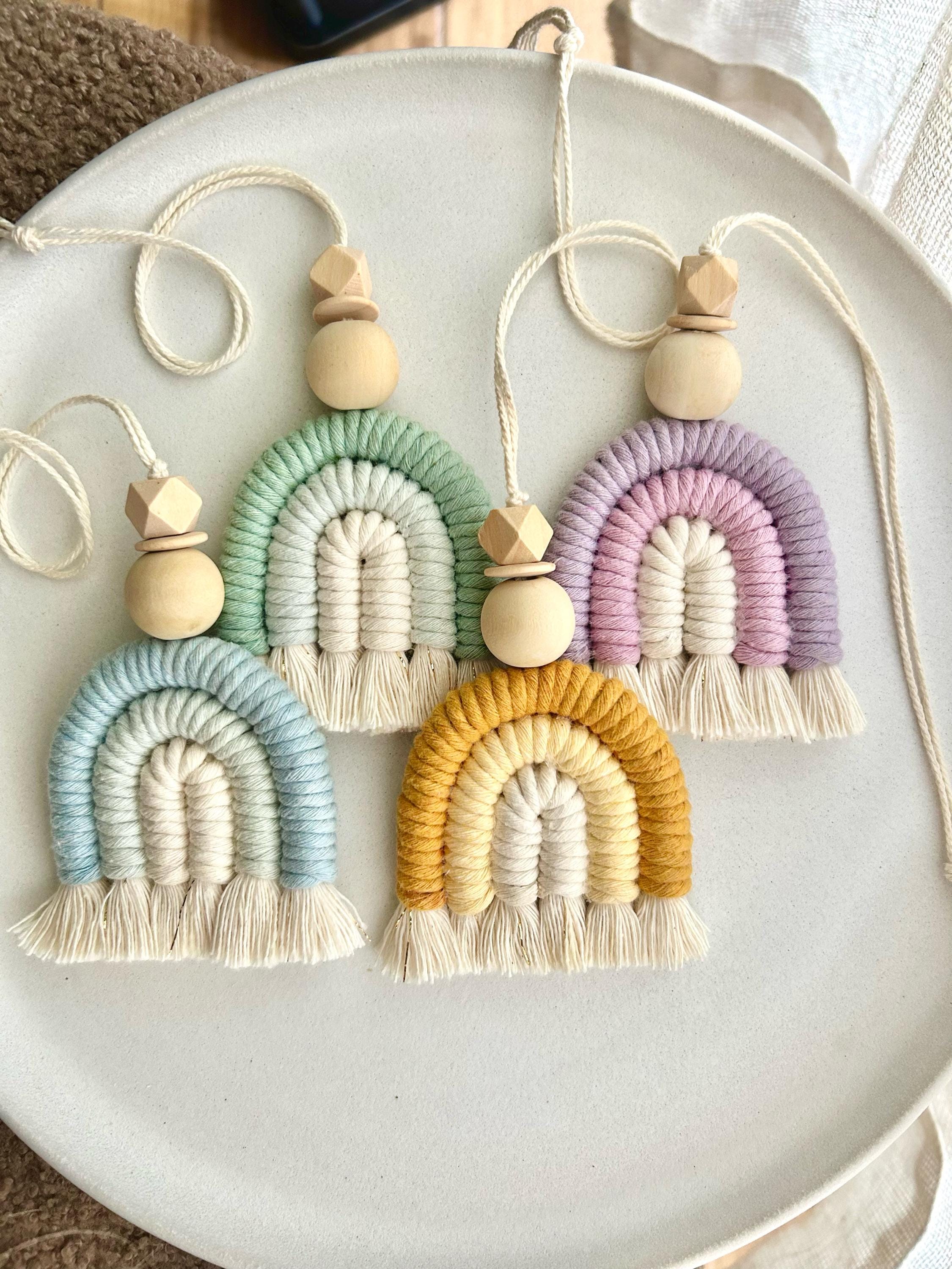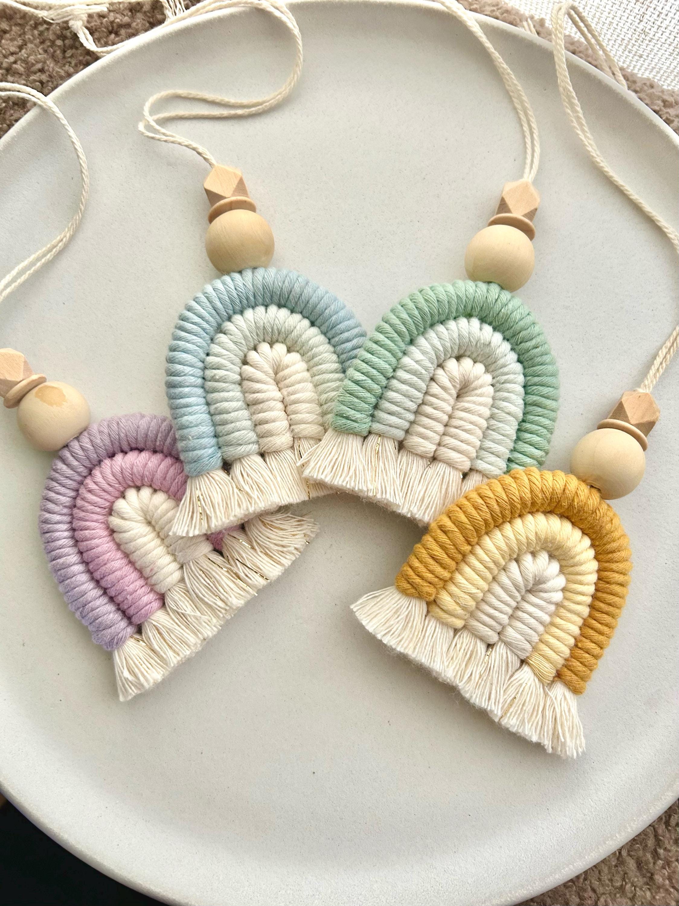 Macramé rainbows, completely handmade, with 100% recycled and biodegradable cotton fibers and natural wood beads. They make great gifts for both adults and children, and can be used as bag, car, or keychain accessories. They can also be used as party favors, place cards, or guest gifts!