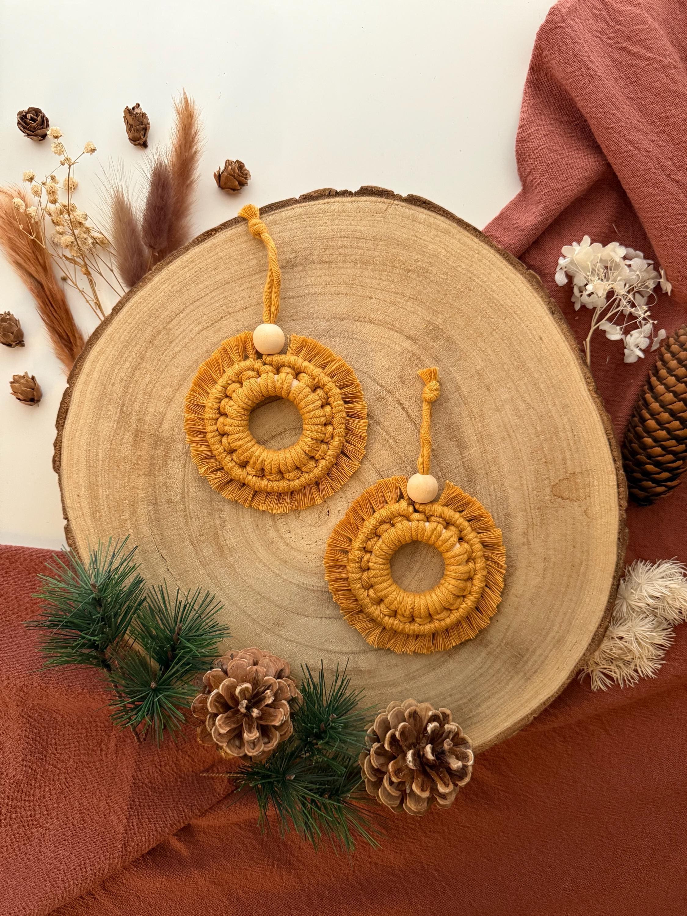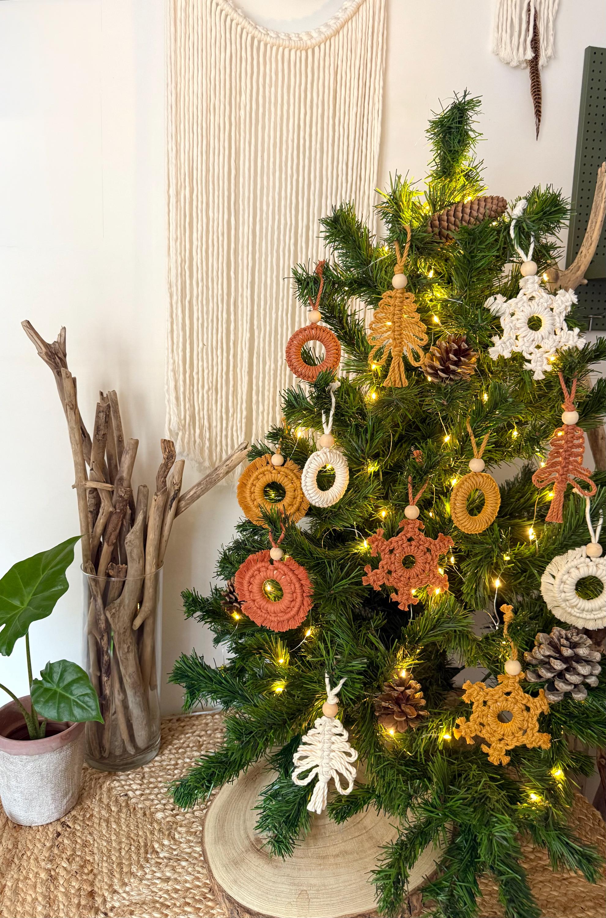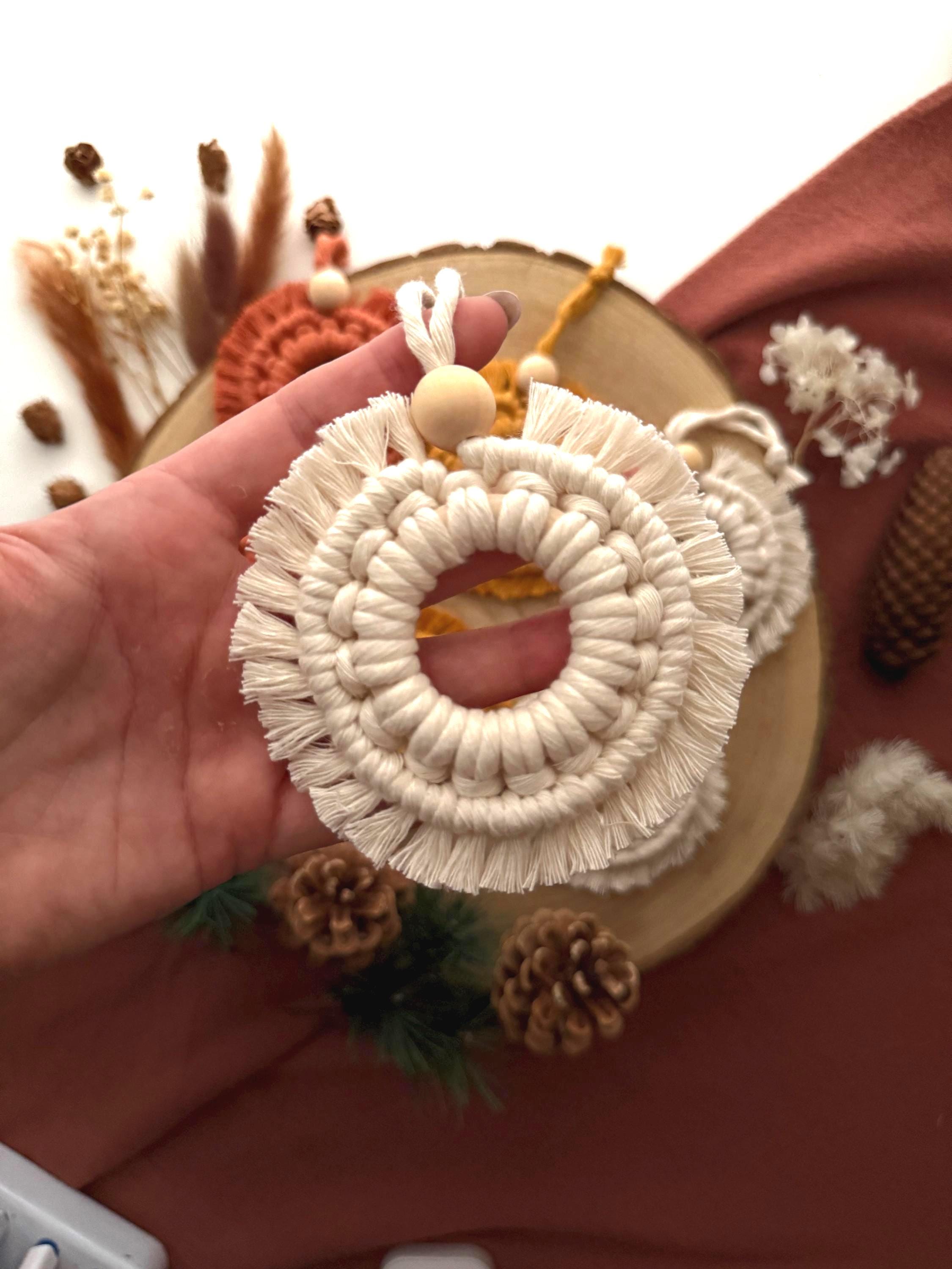 These gorgeous macramé Christmas decorations are completely handmade using macramé, 100% recycled and biodegradable cotton fibers, and natural wooden rings and beads!